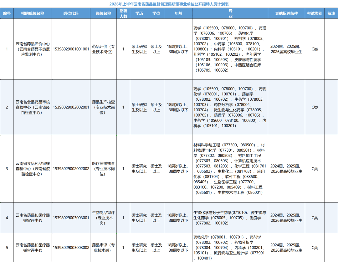 按照《事业单元公开聘请人员暂行》(人事部令第6号)《云南省事业单元公开聘请工做人员法子》(云人社发〔2016〕182号)等法令律例,按照工做需要,经云南省人力资本和社会保障厅核准,2026年上半年云南省药品监视办理局所属事业单元面向社会公开聘请人员5名,现将相关事项通知布告如下:1。云南省药批评价核心(云南省药品不良反映监测核心)是云南省药品监视办理局所属公益一类事业单元。次要承担全省药品、医疗器械平安性再评价,药品、医疗器械、化妆品平安性监测以及药物监测等工做。2。云南省食物药品审核检验核心(云南省疫苗查抄核心)是云南省药品监视办理局所属公益一类事业单元。次要承担食物(保健食物)、药品、医疗器械、注册、出产现场查抄;承担药品批发企业、零售连锁总部、互联网发卖第三方平台相关现场查抄等工做。3。云南省药品和医疗器械审评核心是云南省药品监视办理局所属公益一类事业单元。次要承担全省药品、医疗机构制剂、医疗器械,以及中药材质量尺度、中药饮片规范的手艺审评工做。德才兼备的用人尺度,按照“公开、平等、合作、择优”的准绳,面向社会,公开报名,同一测验,分析评定,择优聘用。
